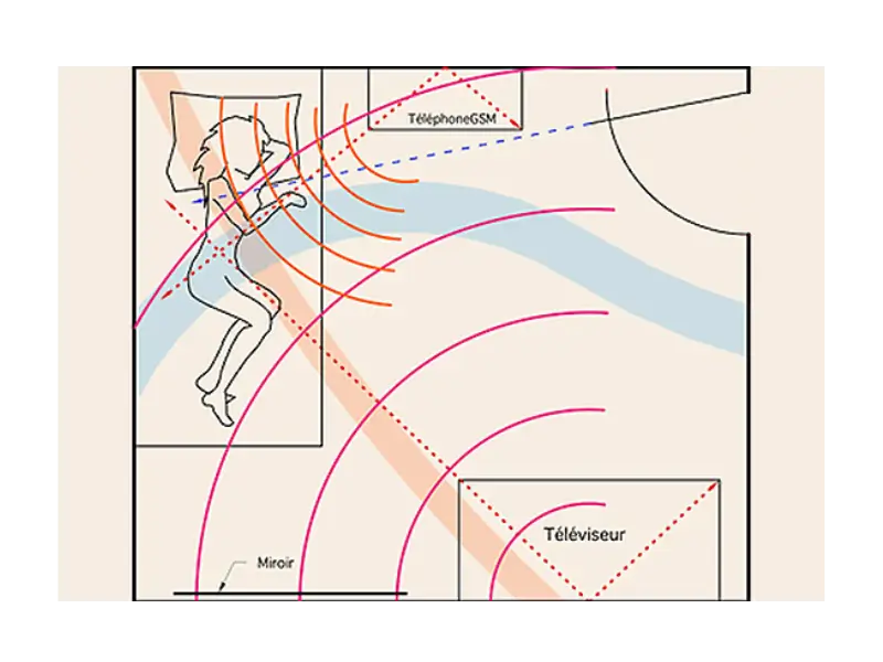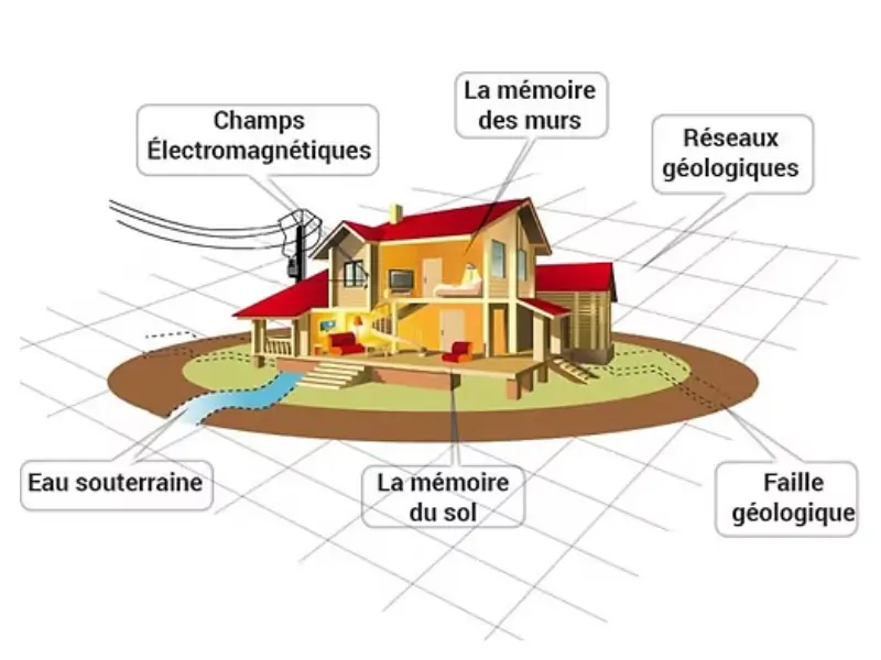 • Repérage des aspects cosmotelluriques / telluriques : réseaux, failles ou eau souterraine, cheminées cosmo-telluriques nocifs (…) pour les humains car ils induisent des perturbations énergétiques. Cela peut être très gênant s’ils passent sous votre lit par exemple. Souvent, on y observe les emplacements préférés du chat, le passage de fourmis, des arbres ou plantes en mauvaise santé…